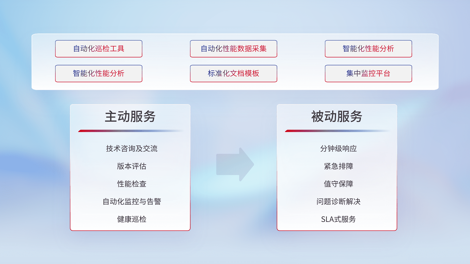 智能化工具和标准化文档,,,保障服务质量,,提供主动服务(包含技术咨询、、、、版本评估、、、、性能检查、、自动化监控与告警、、、健康巡检)和被动服务包含(分钟级响应、、、、紧急排障、、、值守保障、、、问题诊断解决、、SLA服务)。。