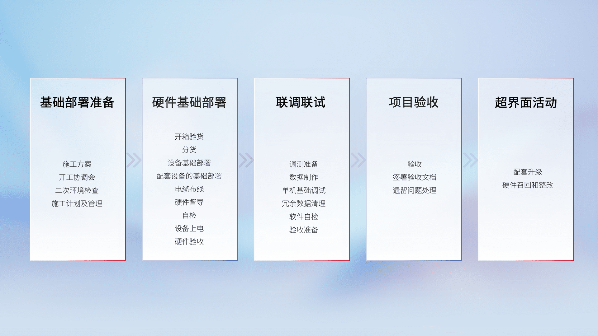 从基础部署准备、、、、硬件基础部署、、、联调联试、、、、项目验收、、越界面活动的全过程可追溯,,保证施工质量和进度。。